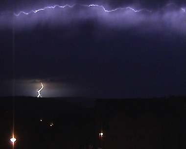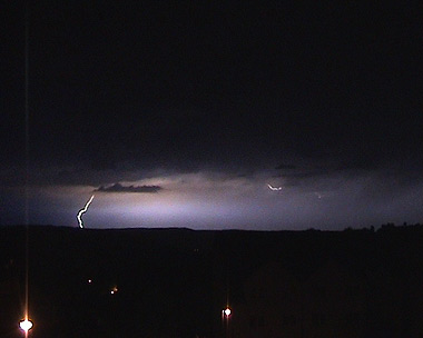 Die Zellen überquerten nun meinen Standort. Es gab einige relativ nahe Einschläge mit lauterem Donner. Ansonsten gab es bei deutlicher Abschwächung weder Sturm noch Starkregen, da ,wie bereits gesagt, die Zellkerne meinen Standort verfehlten oder bereits in stark abgeschwächter Form hier eintrafen. Das herrliche Feuerwerk entschuldigte aber jegliches Fehlen von Begleiterscheinungen, die vielleicht bei der Blitzbeobachtung gestört hätten. Etwa 1 Uhr nachts zogen die Überreste weiter nach Osten ab und zerfielen dort. Grund für die Abschwächung des Gewitters war ein Drehen des Windes von West nach Nordwest. Am Horiziont, so etwa in Richtung Ostthüringen, konnte man jedoch noch einen sehr aktiven Teil des ehemaligen Gewitterclusters erkennen. Dort entstanden nach wie vor intensive Zellen, was anhand der hohen Blitzrate von 30-40 Stück pro Minute deutlich erkennbar war. Ich glaubte nicht wirklich daran, das die Zellen bis hierher durchhalten würden.