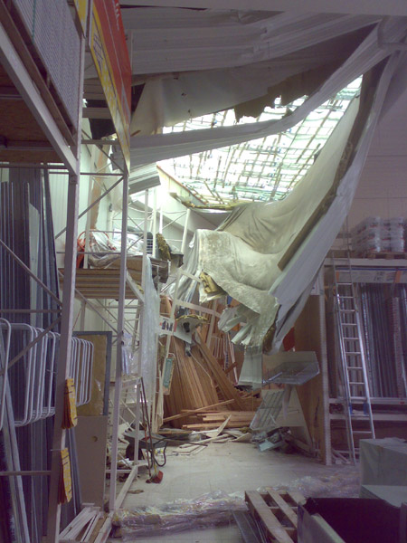 Das nun folgende Bild wurden von Andy Offenderlein zur Verfügung gestellt und zeigt den Schaden nach dem Dacheinsturz im Baumarkt in Schwarzenberg: