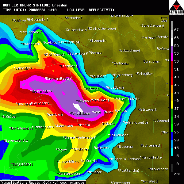 Noch etwas zu den Radarbildern von Iras: Die Reflektivitäten können mitunter noch stärker sein wie auf den Bildern gezeigt. Deutlich wurde dies unter anderem, als die Superzelle frisch entstanden war und unter dem Abdeckungsbereich der Radarstandorte Dresden und Eisberg lag. Unter Einbeziehung des Radars Eisberg war der Hagelkern bedeutend größer und erstreckt sich sogar bis Schwarzenberg, wo es ja auch Schäden durch Wasser und Hagel gab. Dabei war ein breiter Kern mit > 59 dBZ erkennbar, teils über 63 dBZ. Betrachtet man im gleichen Bereich nur den Standort Dresden, erscheint der Kern deutlich kleiner bzw. damit auch schwächer. Eventuell stört hier die Orographie ein wenig die genaue Abtastung ausgehend vom Standort Dresden, dessen Radarmaterial in dieser Analyse Verwendung fand (ohne die Standorte Eisberg oder Neuhaus).