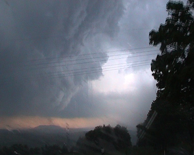 16:30 Uhr, zum Zeitpunkt der stärksten Ausprägung des Hook-Echos, gab es über Henneberg und Augustusburg einen Tornado. Das folgende Bild wurde von Familie Zimmermann in Witzschdorf aufgenommen und zeigt den Tornado über Augustusburg: