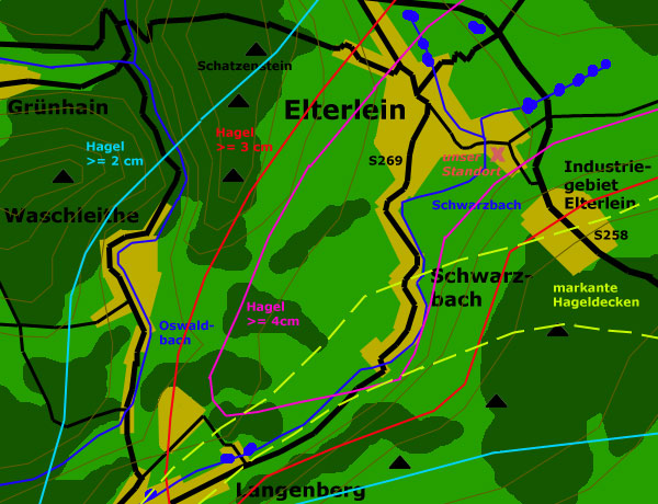 Gegen 15:15-15:20 Uhr fing es im Ort Schwarzbach zwischen Elterlein und Langenberg an zu hageln. Laut Augenzeugen begann der Hagelschlag mit einigen wenigen, großen Hagelkörnern um 4 cm, teils auch etwas größer. Diese beschädigten bereits Autos und Häuser. Richtung Westen fiel der Großhagel noch etwas dichter, traf dort allerdings nur Felder. Kurz darauf ging ein heftiger Hagelsturm über dem Ort nieder. Dabei fiel fast reiner Hagelschlag mit Körnungen von 1-3, teils weiterhin 4 cm Durchmesser. Rasch bildete sich eine Hageldecke. Etwa 15:35 Uhr lies das Unwetter wieder nach. Die Hageldecke erreicht zwischen 10-20 cm Höhe, die Bäume waren erheblich entlaubt.