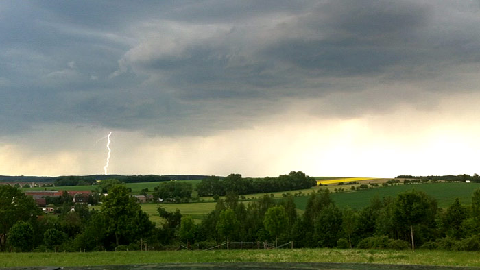 Ich beobachtete den Gewitteraufzug von Wegefarth nahe Freiberg aus. Kurz bevor die Gewitterlinie hier eintraf, gab es einen outflowbedingten Staubsturm, der kleinere Äste von Bäumen abbrach. Das System begann sich anschließend langsam abzuschwächen. Dennoch reichte es in Oberschöna, Linda und St. Michaelis für Starkregen und einige Naheinschläge, bevor das auslaufende System Richtung Dresden abzog.