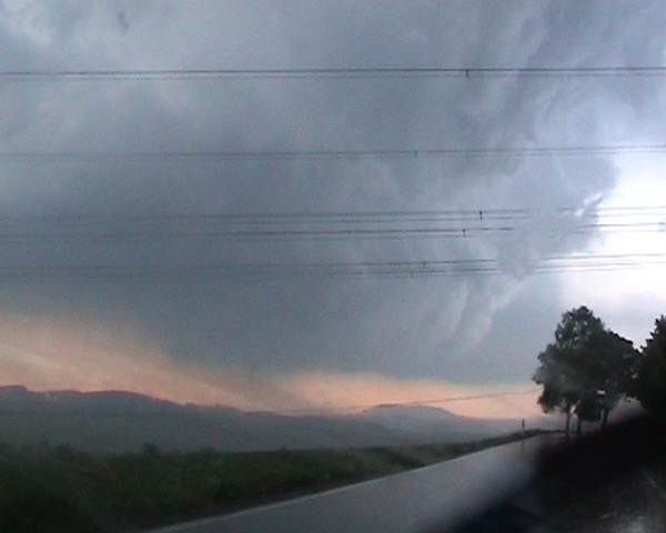 Als wir Richtung Grünhain weiterfuhren, gab es heftigen Platzregen mit Hagel bis 1 cm, die Sicht war stark herabgesetzt. Der Blick auf das Radar zeigte, dass sich das System mehr und mehr organisierte. Da wir aufgrund des Niederschlagsradars bzw. der dort gezeigten Signatur die Vermutung hatten, dass es sich hierbei eventuell um eine Mesozyklone handeln könnte, führen wie Richtung Elterlein aus dem Starkniederschlag heraus, um uns einen besseren Überblick über die Struktur der Zelle zu verschaffen. Der Atem stockte uns, als wir in Elterlein aus dem Niederschlag herauskamen. Ein gewaltiges, äußerst dynamisches System lag vor uns, nämlich eine wunderbar strukturierte Superzelle.