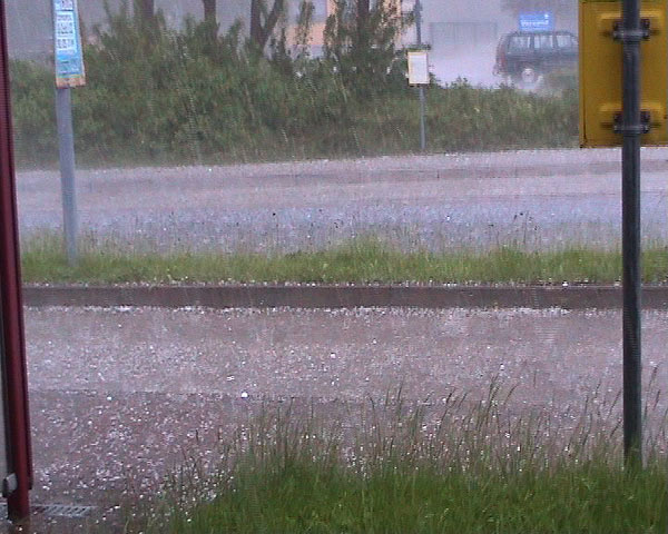 Höhepunkt des Hagelschlages, neben dichtem kleinen Hagel auch Körnern bis 4 cm Durchmesser!