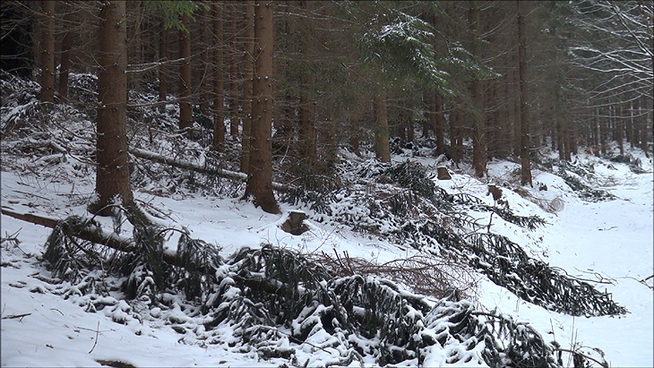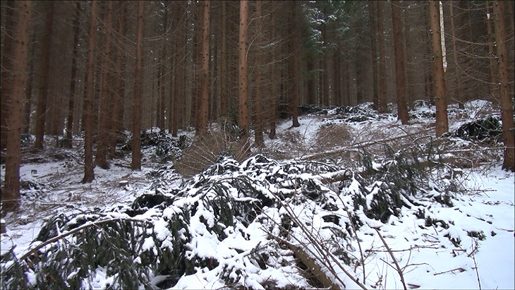 der Waldboden ist von abgebrochenen Baumkronen und -spitzen übersät