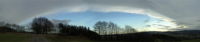 Panorama der ausgebildeten Wallcloud, rechts im Bild der Niederschlagsbereich mit dem Extremhagel
