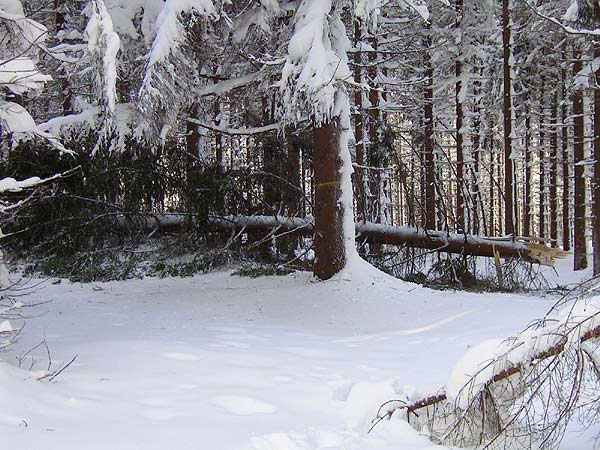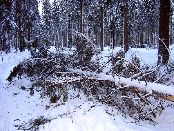Ab dem 24.1.05 setzten in Folge von Tief Lutz, welches von Norden her nach Deutschland hineinzog, starke Schneefälle ein. In den folgenden 48 h fielen im mittleren Erzgebirge verbreitet 45-50 cm Pulverschnee. Schlimmer noch war jedoch das folgende Unwettertief Michael am 31.1.-2.2.05. Dieses brachte mit einer nordwestlichen Strömungsrichtung leicht milder Luft nach Mitteleuropa, sodass in den Tieflagen kräftiger Regen einsetzte und die dort zuvor entstandene Schneedecke wieder abtaute. Oberhalb von 400 m fiel jedoch heftiger Nassschneefall. Innerhalb von nur 12 h fielen 30 cm schwerer Nassschnee, nach kurzer Beruhigung bei Annäherung einer markanten Kaltfront mit eingelagerten Wintergewittern nochmals 15 cm innerhalb von nur 30 Minuten! Das war der heftigste Schneefall in Verbindung eines Gewitters, den ich je erlebt habe. Die Gesamtneuschneehöhe betrug also gut 40-50 cm (Nassschnee). Dazu kommen noch zusammengesackten 30 cm von Tief Lutz, ingesamt also 80 cm, welche jedoch in den Folgetagen aufgrund des hohen Eigengewichtes auf 70 cm zusammensank. Die Schäden dieses Nassschneefalls waren bereits erheblich! 30.000 Festmeter Bruchholz im Landkreis Aue-Schwarzenberg, 20.000 Festmeter im Vogtland. Mehrere Dächer wurden beschädigt, das Dach einer Einkaufsfiliale in Beierfeld (ASZ) brach sogar teilweise ein.